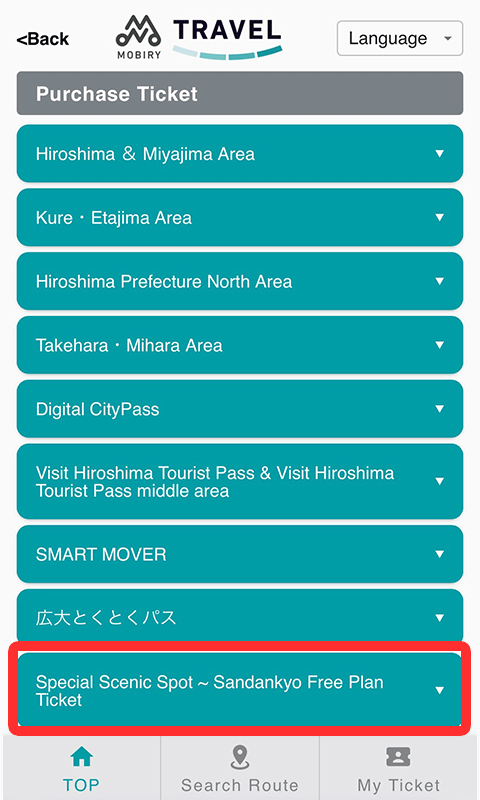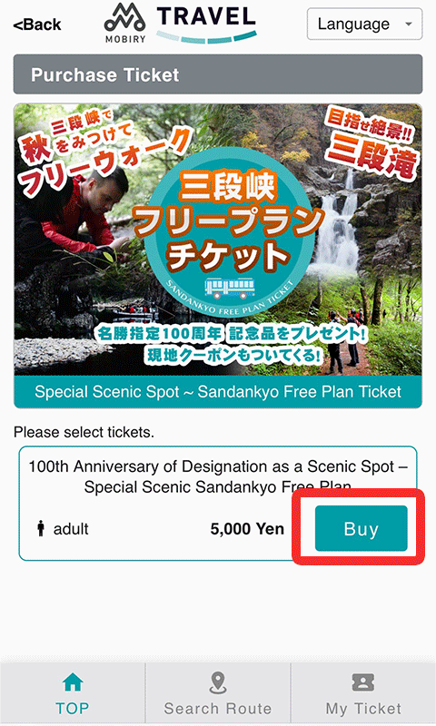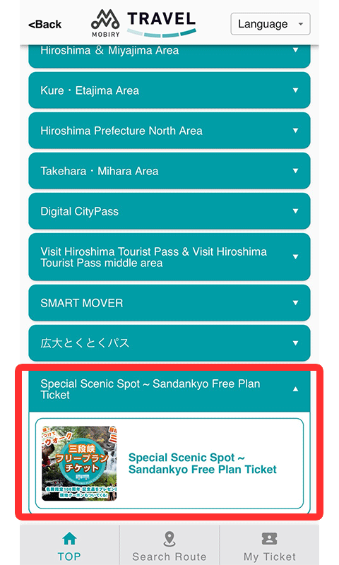 Tap “Special Scenic Spot~Sandankyo Free Plan Ticket.”