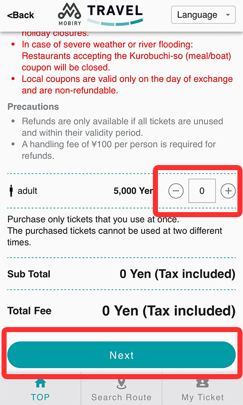 On the ticket selection screen, choose the number of tickets and tap “Next.”